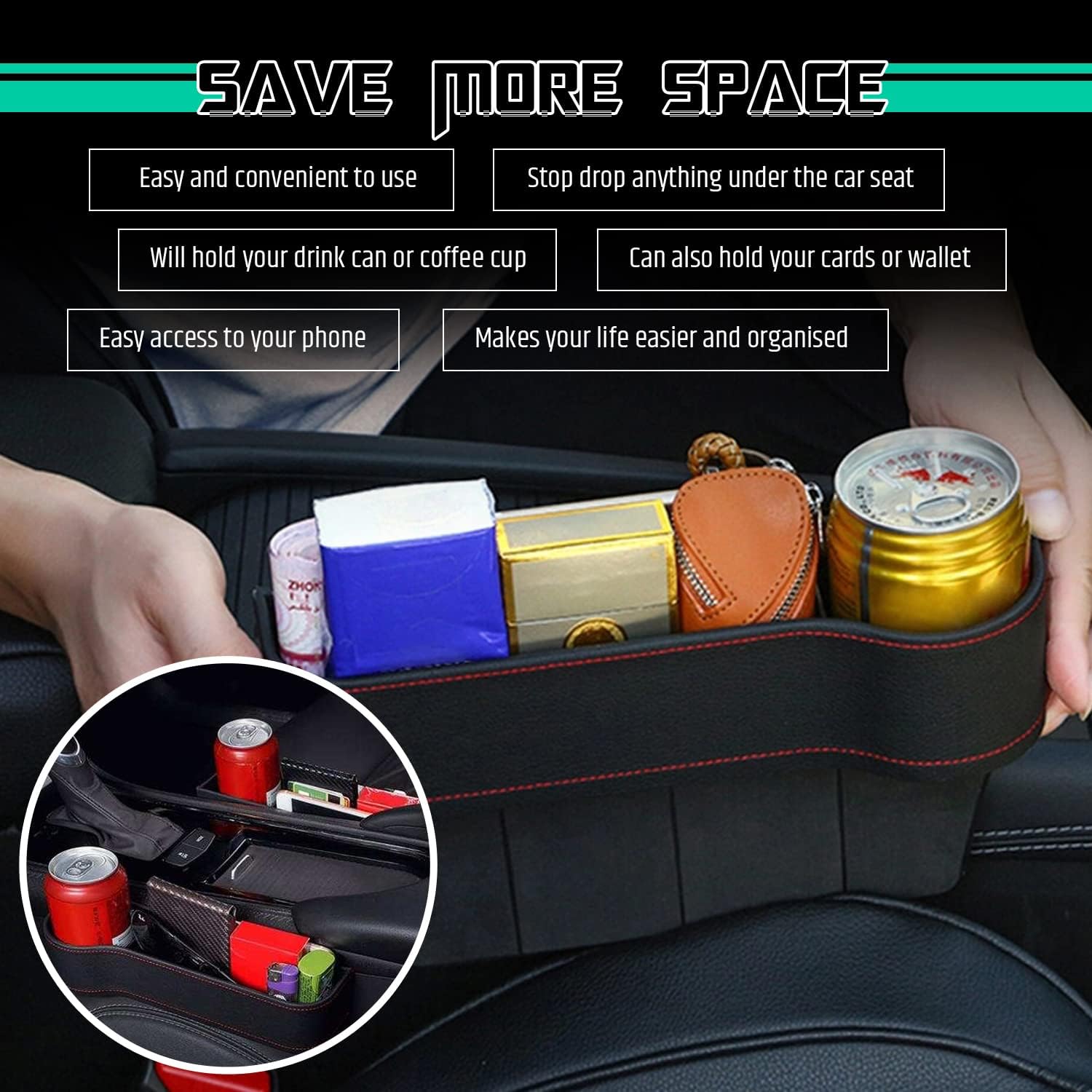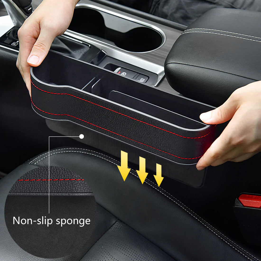 Our organizer fits right in that infamous seat-center console gap so items no longer go missing. Instead, you can keep everything sturdily in place and within arm’s reach from your phone to drink to lip balm and spare coins.